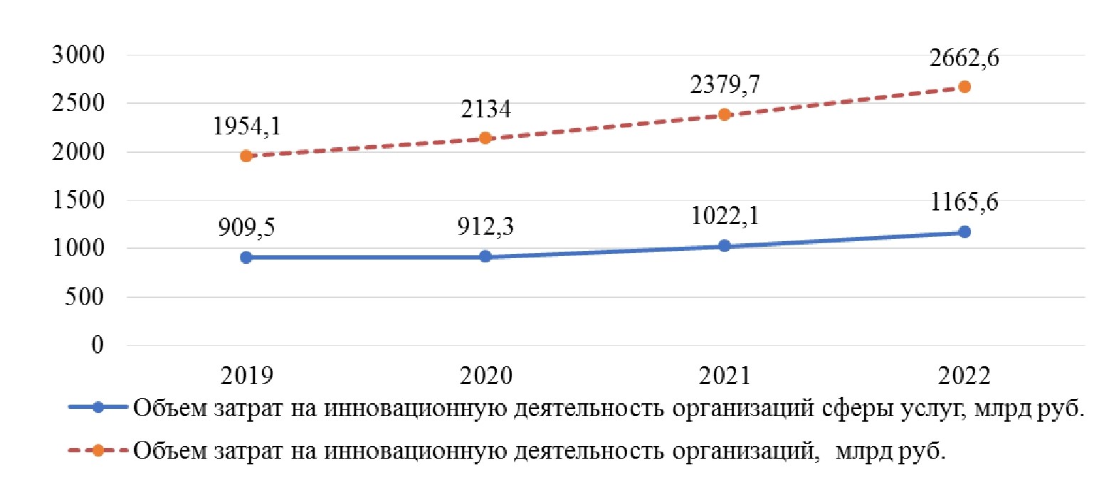 Подтверждением потенциального роста инновационной активности организаций, в том числе организаций сферы услуг, в будущих периодах могут служить данные об увеличении затрат на инновационную деятельность в 2022 г. (рисунок 2), не смотря на снижение инновационной активности организаций.