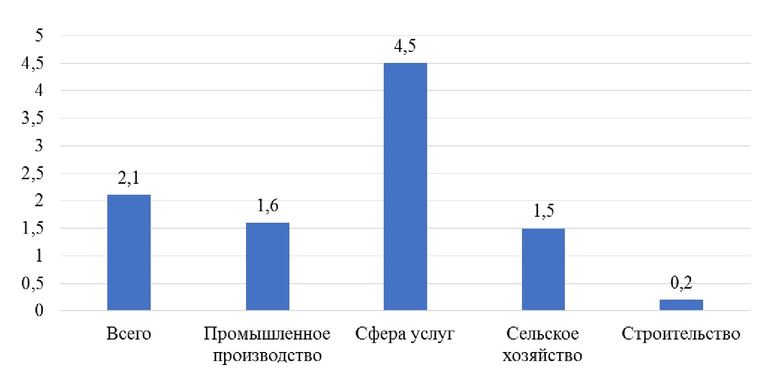 На диаграмме мы видим, что доля организаций сферы услуг, реализующих инновационные услуги, выше, чем доля аналогичного показателя в других сферах, даже чем в сфере промышленного производства, которое традиционно является драйвером инновационного развития экономики и имеет более высокие показатели инновационной активности организаций. Такие значения данного показателя говорят о высокой конкуренции в рассматриваемой сфере, которую невозможно выдержать без вывода на рынок инновационных услуг, тем самым обеспечив себе преимущества. Тем самым подтверждается высокий инновационный охват организаций сферы услуг. Для определения активности инвестиций организаций сферы услуг в инновации, рассмотрим значение показателя интенсивности затрат на инновационную деятельность в сопоставлении с другими отраслями (рисунок 5).
