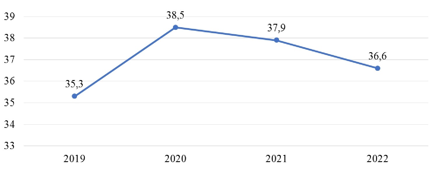 Представленный график отражает увеличение доли организаций сферы услуг, осуществлявших инновации в области методов обработки и передачи информации в 2020 г. в сравнении с 2019 г., а также последующее превышение значений показателя 2019 г. в 2021 и 2022 гг. Пандемия COVID-19 потребовала увеличения обработки и передачи информации, вызванного переходом от классических форматов предоставления услуг к цифровым, что, в свою очередь, отразилось на инновациях в данной сфере.