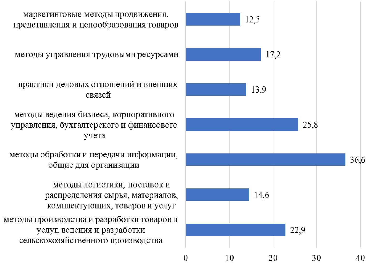 В структуре видов инноваций, которые осуществляли организации сферы услуг в 2022 г., с большим опережением превалируют инновации в области методов обработки и передачи информации, опережая инновации в области методов ведения бизнеса, корпоративного управления, бухгалтерского и финансового учета более чем на 10%, что, в свою очередь, фиксирует возрастающее значение цифровой трансформации для исследуемой сферы.