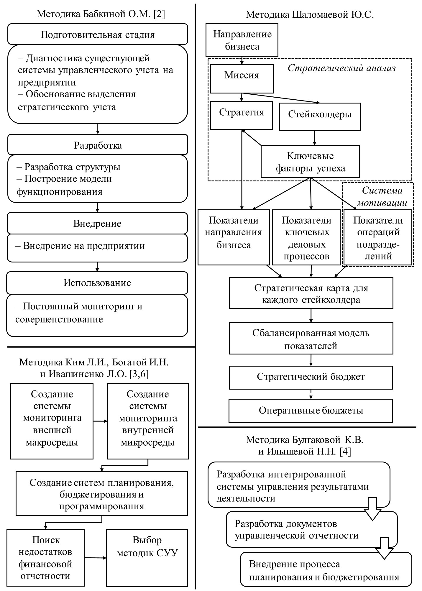 Увеличение объективной потребности в интеграции стратегических инструментов в системы менеджмента и учёта при отсутствии полноценной единой теоретической базы создают определенные проблемы на этапе разработки и практической реализации стратегической системы. В ходе исследования подходов к внедрению стратегического управленческого учета в бизнес-процессы экономических субъектов были проанализированы, на наш взгляд, четыре наиболее перспективные и универсальные авторские методики отечественных специалистов (рисунок 2).