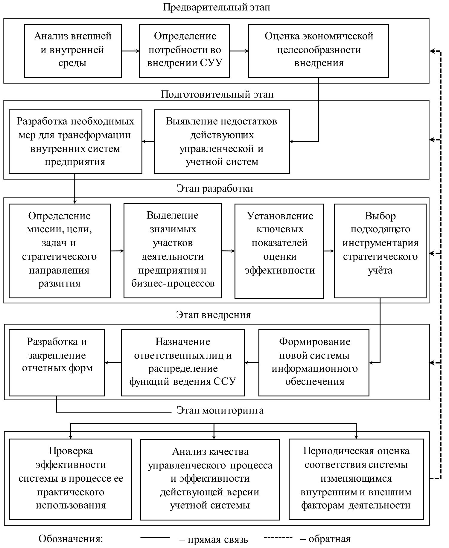 Последовательное прохождение первых четырёх этапов и реализация входящих в них процедур создают условия для постепенного преобразования внутренних элементов экономического субъекта и их интеграции в новую стратегически направленную модель учёта и управления. Благодаря анализу внутренней и внешней среды специалистами устанавливается потребность в формировании системы стратегического управленческого учёта и оценивается экономическая целесообразность данного решения. В случае положительного исхода дальнейшая задача заключается в подготовке фундамента для последующих нововведений путем трансформации внутренних систем экономического субъекта и устранения потенциальных преград для внедрения. Этап разработки опирается на миссию, цели и задачи субъекта хозяйствования, согласованные с планами ее долгосрочного развития. Исходя из этого, а также отраслевой специфики деятельности, выделяются ключевые бизнес-процессы, показатели для оценки их эффективности и подходящие для использования в текущих условиях инструменты стратегического управления. В ходе этапа внедрения на базе всех предыдущих наработок формируется новая система информационного обеспечения управленческих решений, назначаются ответственные лица и закрепляются формы отчетности, которые впоследствии ложатся в основу системы мотивации и дают возможность оценки степени достижения целей стратегического развития.
