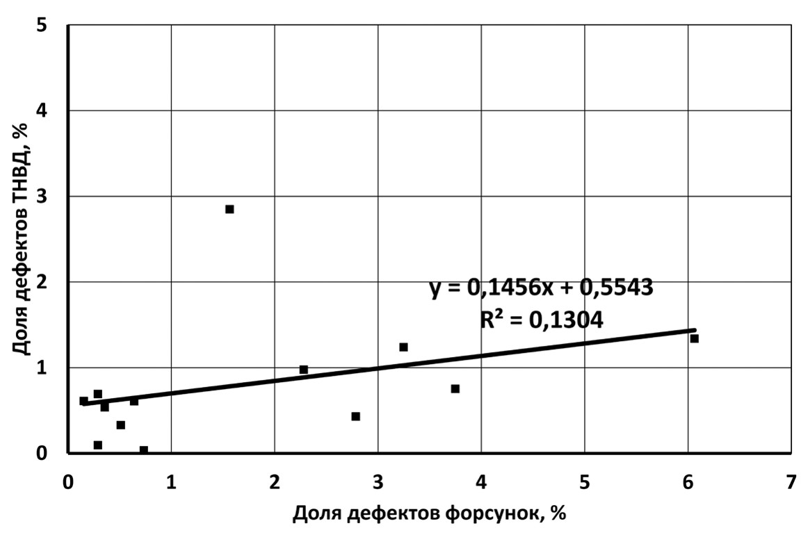 Между долями дефектов ТНВД и форсунок имеется слабая корреляционная связь (рисунок 4).