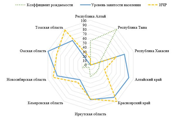 Лидирующую позицию по ИЧР занимает Красноярский край (0,873), далее следуют Томская область (0,871), что чуть выше среднего показателя индекса человеческого развития по России – 0,87. Наиболее низкий ИЧР отмечается в Алтайском крае (0,815), Республике Алтай (0,800), Республике Тыва (0,787). Сохраняется значительный разрыв по данному показателю внутри федерального округа. Полученный авторами результат совпадает с подходом З. И. Калугиной, которая считает, что причиной такого разрыва является низкий уровень ресурсов для инвестирования в развитие человеческих ресурсов, небольшое количество образовательных услуг с низкой социальной и транспортной доступностью, недоступность рекреационных ресурсов из-за нехватки финансирования социальной жизни [6].