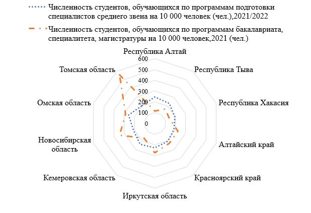 Наибольшее число обучающихся по программам высшего образования отмечается в Томской области (556). Данную область можно классифицировать как образовательный «регион-хаб» Сибирского федерального округа. Регион-хаб является «административно-территориальным образованием, географическое положение и инфраструктурное состояние которого позволяет обеспечивать услуги других регионов» [7]. Наименьшее число студентов, получающих высшее образование, отмечается в Республике Алтай (114). Среднее профессиональное образование больше всего распространено в Омской области (259), Республике Алтай (245), Кемеровской области (237). Самая низкая доля среди студентов со средним образованием в Алтайском крае (185).