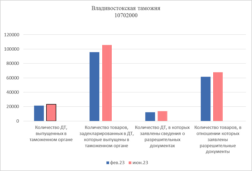 В приведенной выше таблице рассматриваются декларации на товар (ДТ), помещенные под заявленную таможенную дату. Как следует из таблицы, таможенные органы на Дальнем Востоке в текущем году активно используют систему предварительного информирования в ходе оформления таможенных деклараций и организации пропуска товаров. Таблица охватывает период с февраля по июнь 2023 года включительно. При сравнении февральских показателей с аналогичными данными за июнь приходим к выводу, что система предварительного информирования дает устойчивый результат. Это подтверждается примерно одинаковыми динамическими показателями за два идентичных периода, что подразумевает сохранение объемов трафика на стабильном приемлемом уровне и позволяет сокращать нагрузку на таможенные органы. Для большей наглядности приведем данные касательно Владивостокской таможни в виде диаграммы.