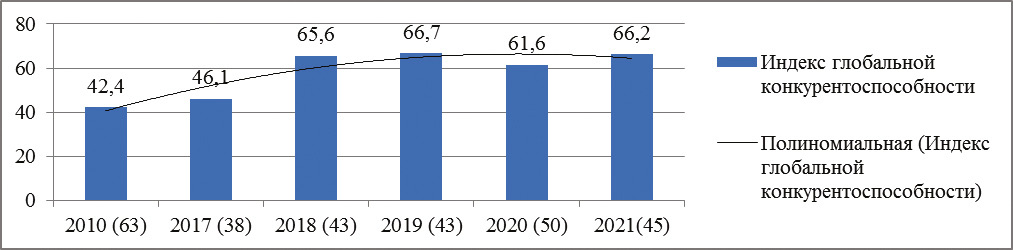 Тем не менее, в рейтинге глобального индекса конкурентоспособности Россия за последние десять лет поднялась на 18 пунктов с 63 места из 137 в 2010 году до 45 места в 2021 году (рисунок 1).