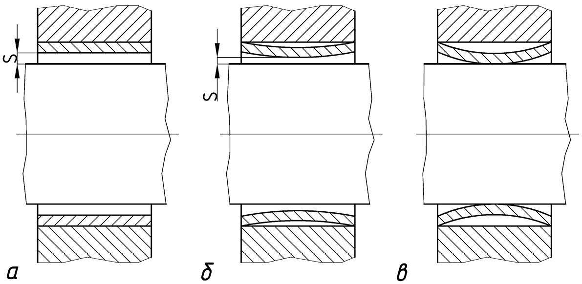 Рисунок 1. Схема формоизменения (развития деформации) шатунного вкладыша (S − зазор в сопряжении): а) вкладыш в нормальном состоянии; б) начальная стадия деформации (снижение зазора); в) последняя стадия деформации (зазор отсутствует)