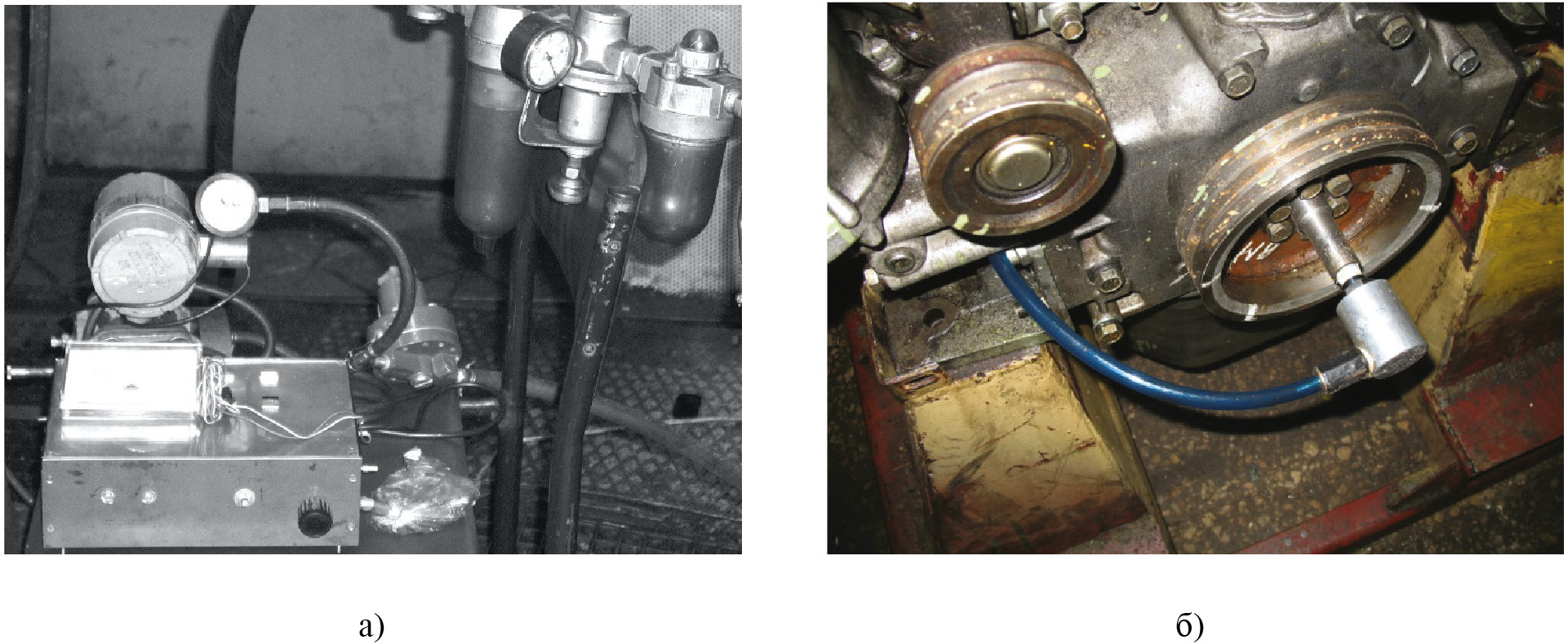Рисунок 4. Фотографии элементов устройства для определения зазора в шатунном подшипнике коленчатого вала двигателя: а) измерительный блок, узел подготовки воздуха, дифференциальный манометр; б) приемный штуцер ДВС и переходная муфта для подвода воздуха
