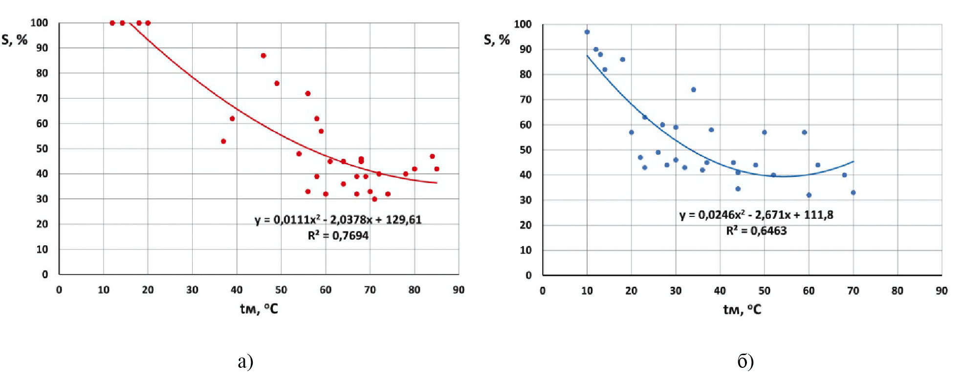 Рисунок 7. Экспериментальные зависимости параметра S от температуры масла tм для разных стадий опытов: а) «прожарки», б) «остывания»