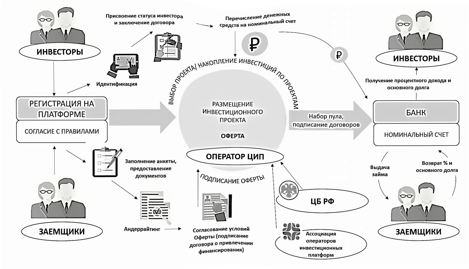 Повышенный интерес к цифровым инвестиционным платформам возник в августе 2019 г. с принятием закона № 259-ФЗ «О привлечении инвестиций с использованием инвестиционных платформ и о внесении изменений в отдельные законодательные акты Российской Федерации». Участниками краудфандинговой платформы, согласно закону, выступают операторы инвестиционной платформы, инвесторы, лица, привлекающие инвестиции, и третьи лица. При этом возникают дискуссии и спорные финансово-правовые вопросы по поводу низкого уровня доверия бизнеса и общества к новым инструментам, необходимости специальных аналитических знаний для сравнения финансовых предложений, доступных на площадках. Развитию краудфандинга препятствуют высокие риски потери вложенного инвесторами капитала в результате экономических, регуляторных, политических событий в стране.