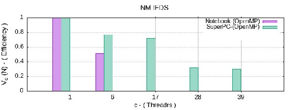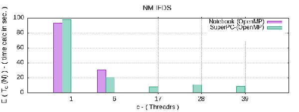 Из результатов анализа эффективности параллельного OpenMP алгоритма IFDS видно, что имеет место существенный прирост скорости вычисления, но при увеличении числа потоков для параллельной обработки, их эффективность заметно снижается. При одинаковых параметрах численного эксперимента обе вычислительные системы выдают искомый результат за приблизительно равное время вычисления. Однако наибольшая эффективность достигается при использовании 10-15 потоков. Из анализа данных видно, что OpenMP параллельная программная реализация IFDS показывает ускорение работы от 9 - 12 раз в зависимости от количества задействованных ядер CPU.