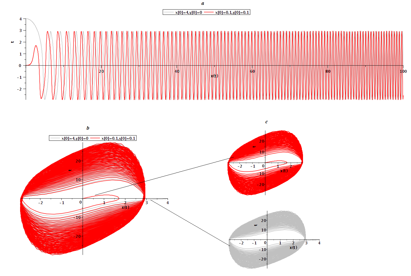 Рис. 3. Осциллограммы a) и фазовые траектории b) для классического осциллятора Ван дер Поля-Эйлера, построенные при , и различных начальных условиях: — серая кривая и - красная кривая; с) более детальное построение фазовых траекторий.