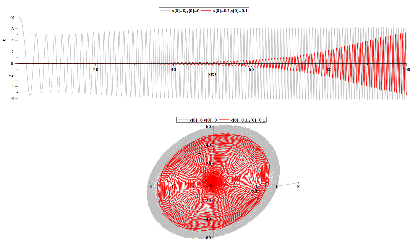 На рис. 6 мы видим несколько интересных режимов. Хаотический режим наблюдается при начальном условии мы видим здесь перемежаемость — чередования квазипериодических колебаний с хаотическими. Другой режим при начальном условии , характеризует бифуркацию Адронова-Хопфа — рождение и уничтожение предельного цикла.