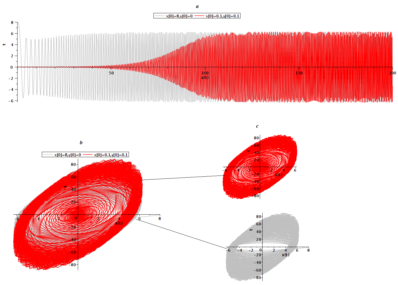 Рис. 2. Осциллограммы a) и фазовые траектории b) для классического осциллятора Ван дер Поля-Эйлера, построенные при и различных начальных условиях: — серая кривая и — красная кривая; с) более детальное построение фазовых траекторий.