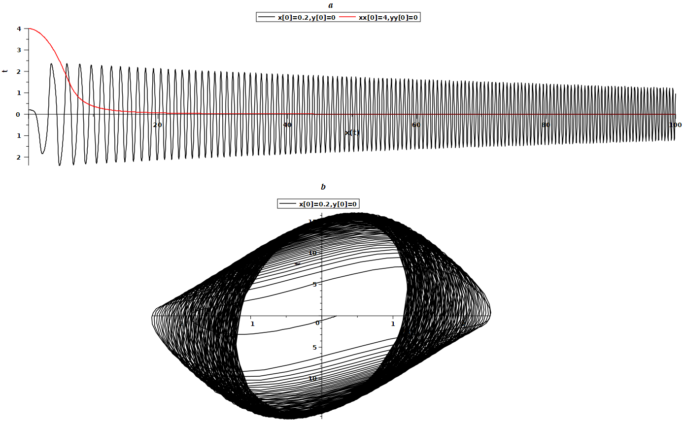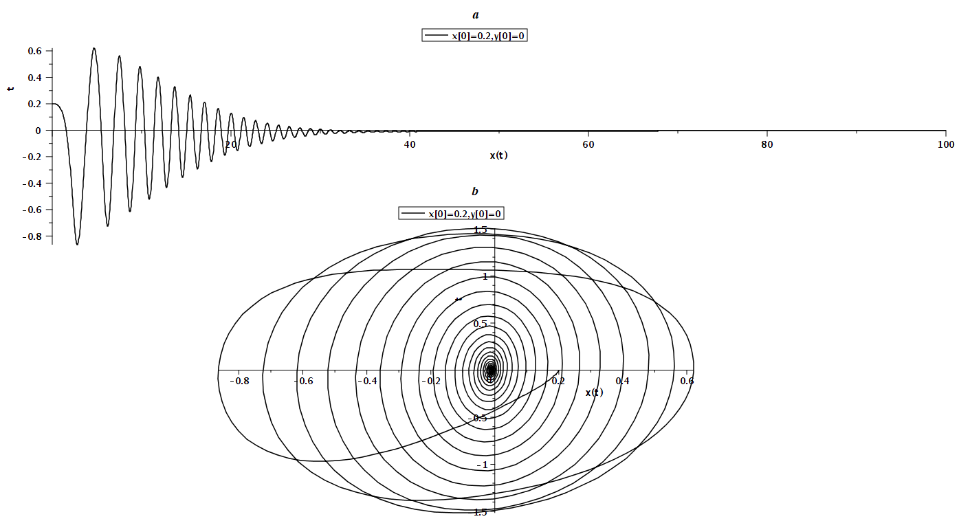 Figure 4. Oscillograms a) for initial conditions and and phase trajectory for the initial condition .