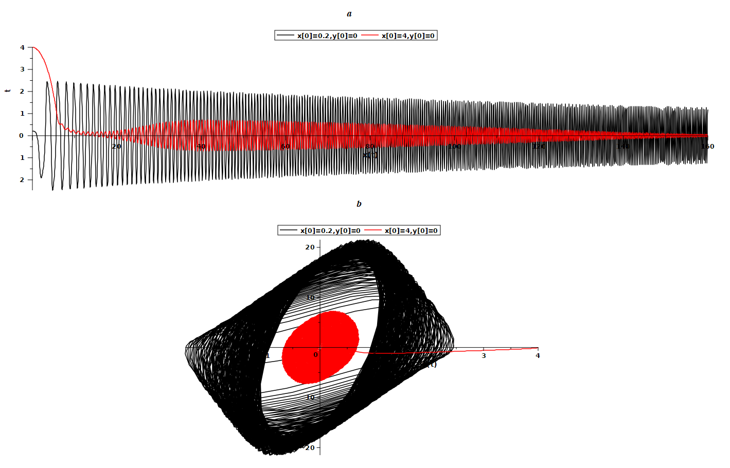 Figure 6. Oscillograms a) and phase trajectories b) constructed according to formula (4) under different initial conditions — red curve and — black curve.