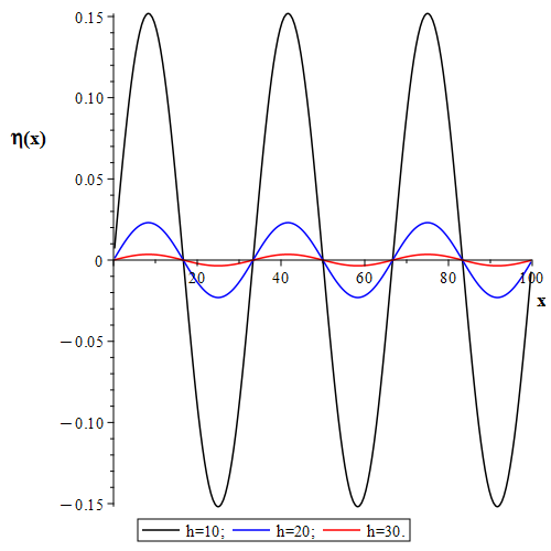 [Figure 1. Dependence of the profile of gravitational waves formed behind an obstacle, depending on the depth of immersion of the wave dipole. Black line - for depth h=10; blue line - for depth h=20; red line - for depth h=30.]