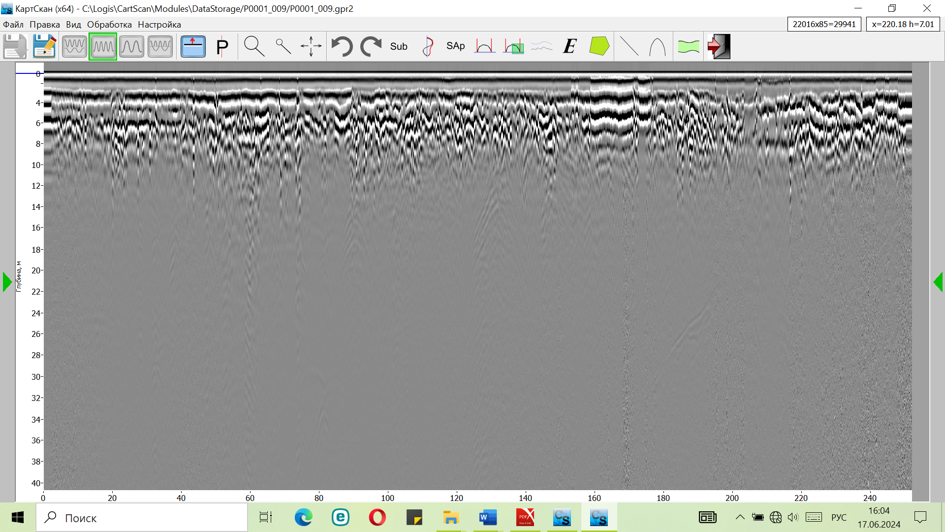 Рис. 4. Пример радарограммы в программе (георадар «Тритон-М». Город Петропавловск- Камчатский)