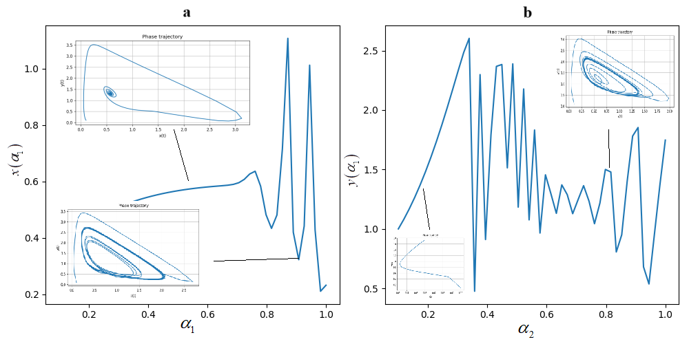 На рис. 2 дается бифуркационная диаграмма сечение поверхности на рис. 1 при для решения (рис.2a) и при для решения (рис. 2b). Мы видим на этих бифуркационных диаграммах, например, на рис.2a три режима, сначала идет затухающий режим вплоть до , причем прерывистая линия вначале указывает на сингулярность. Далее идут всплески, которые указывают предельный цикл. Причем на рис.2a всплески с возрастающей амплитудой указываю на то, что орбита предельного цикла увеличивается. Это подтверждается фазовыми траекториями на врезках к рис.2a и рис.2b.