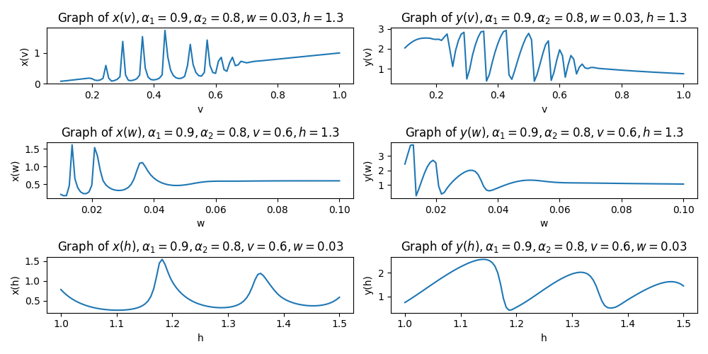 Рис. 6. Бифуркационные диаграммы зависимостей решения x и y от различных значений параметров модели.