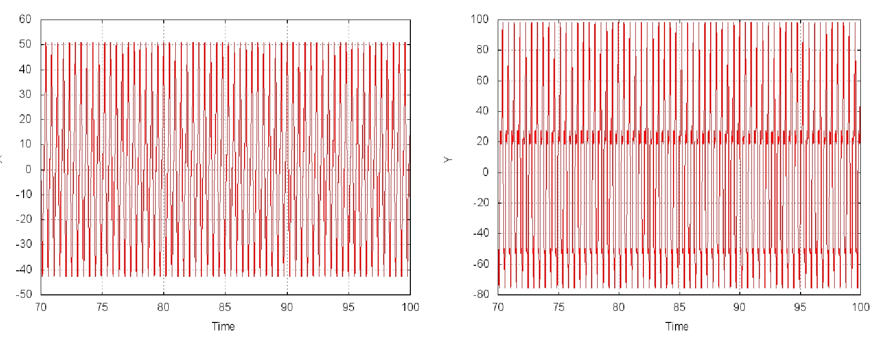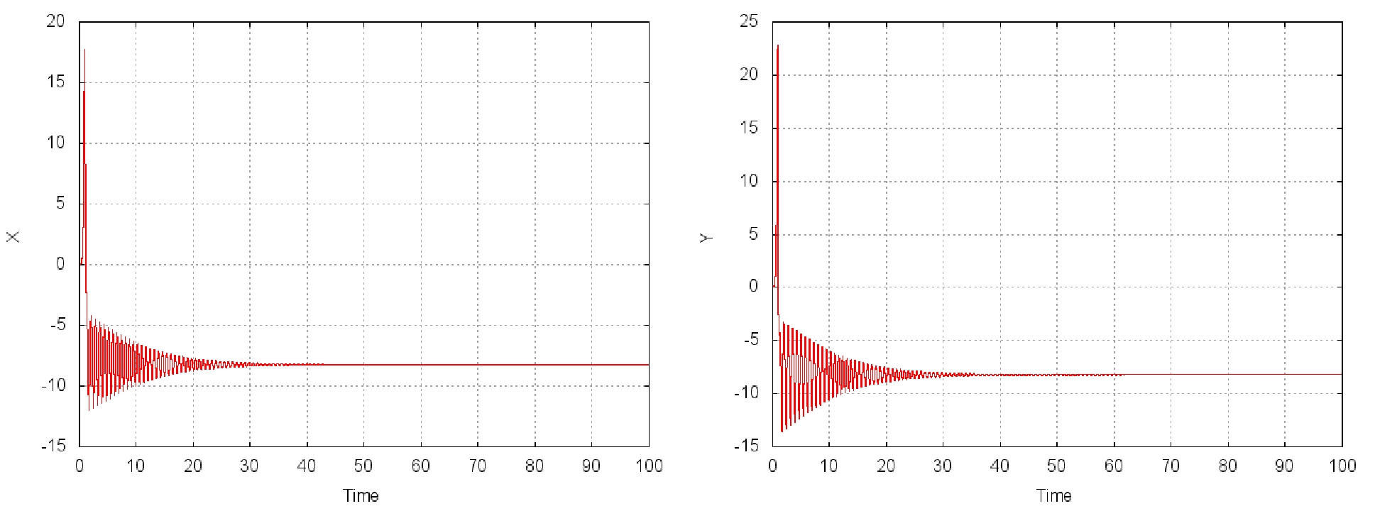 Рис. 1. Фазовая координаты: (a) X при D = 20; (b) Y при D = 20.