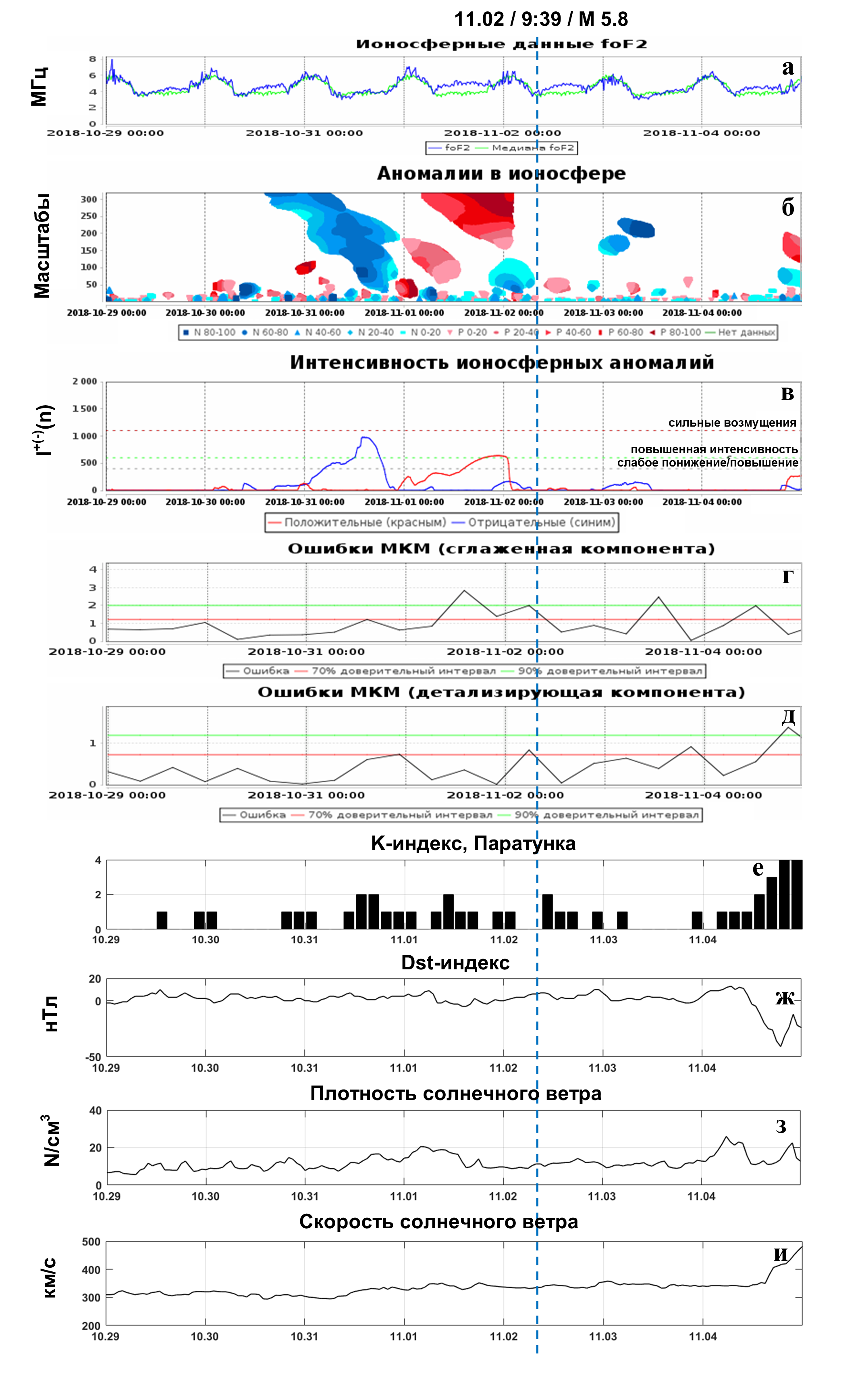 На рис. 4 представлены результаты работы системы «Аврора» по обработке данных foF2 в период сейсмического события от 2 ноября 2018 г. По данным сейсмического каталога https://sdis.emsd.ru/main.php землетрясение произошло на расстоянии 115.48 км от станции регистрации foF2 (координаты землетрясения: 51.980 N; 158.720 E) в 9:39 UTC, имело магнитуду M = 5.8 и глубину 72.4 км. В анализируемый период с 29 октября до 4 ноября геомагнитное поле было спокойным (значения К-индекса не превышают 2, рис. 4 е), скорость солнечного ветра не превышала 350 км/с (рис. 4 и), южная компонента ММП флуктуировала от Bz=±2 нТл до Bz=±4 нТл (https://ipg.geospace.ru).