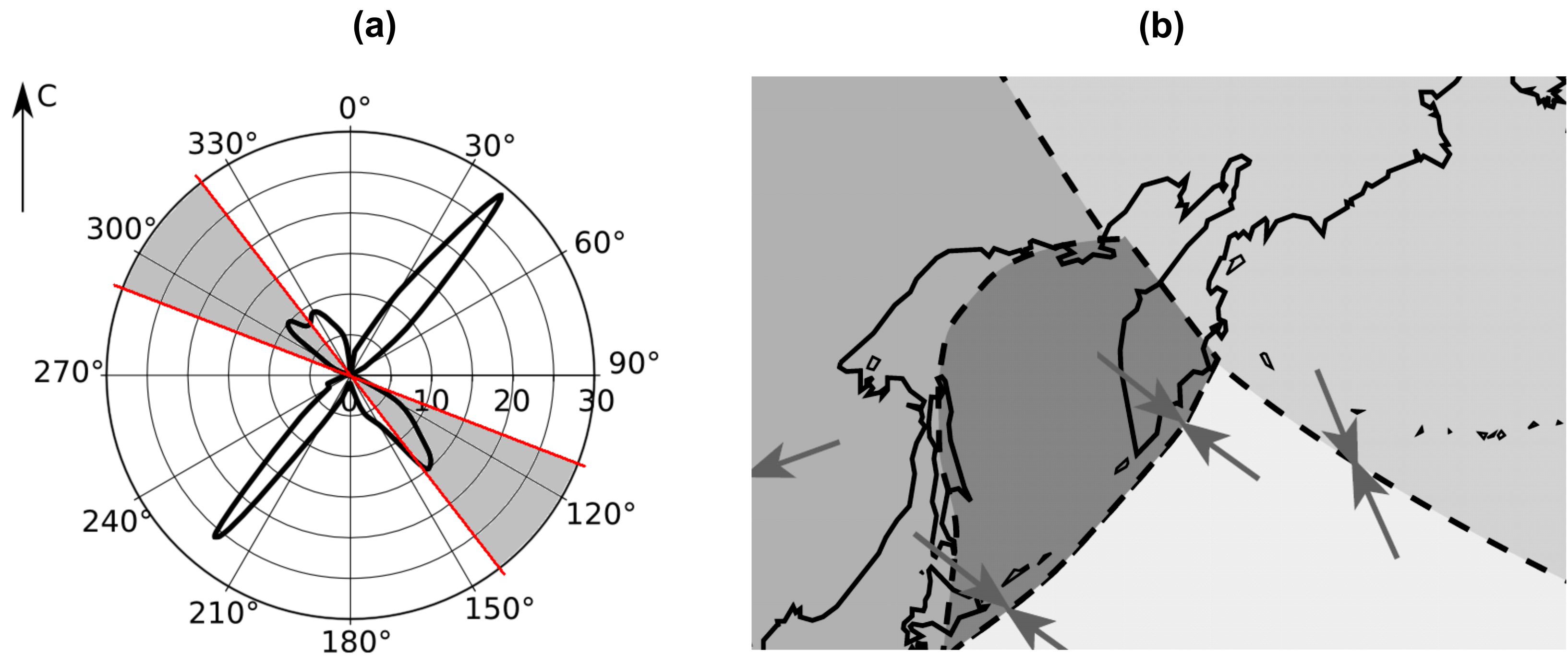 [Figure 2. Estimate of the compression axis orientation before 74 earthquakes within the period 20082012 (a), ■ the compression axis orientation region. Orientation of tectonic stresses near the Kamchatka peninsula, 🡪 🡨 direction of horizontal compression axes (b) [8].]