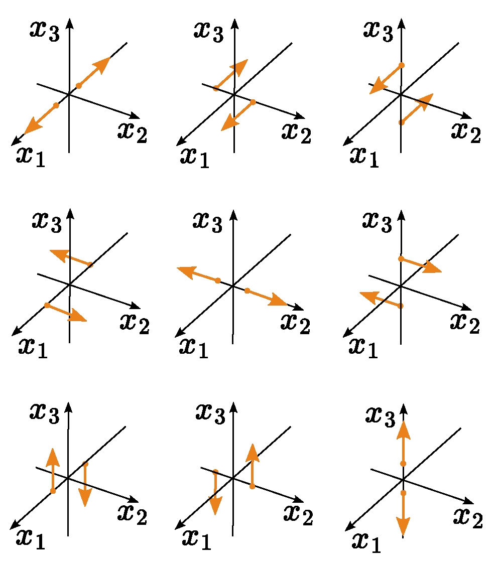 Рис. 3. Девять пар сил, необходимых для получения силового эквивалента при произвольно ориентированном разрыве смещений в среде.