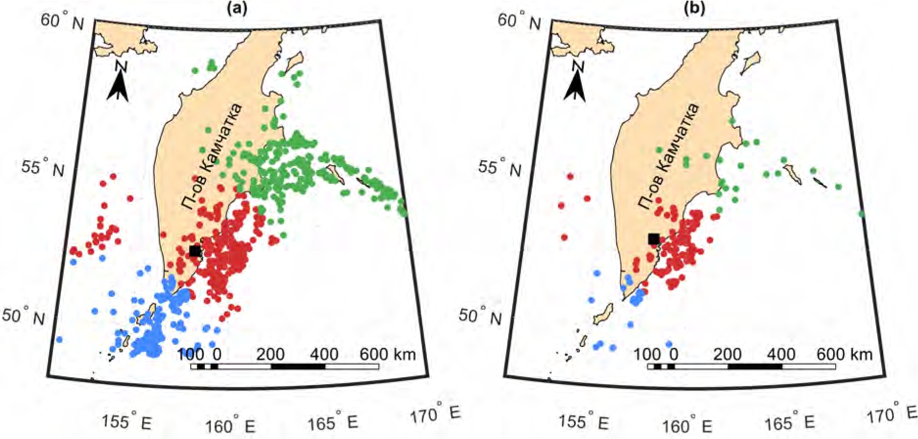 Рис. 4. Все N = 877 землетрясений, разделенные на кластеры по пространственному расположению их эпицентров: • кластер № 1, • кластер № 2, • кластер № 3 (a). Землетрясения, которые по результатам моделирования могли вызвать повышенные деформации в пункте наблюдения «Микижа» ■ (b).