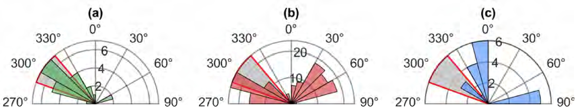[Figure 5. Distribution histograms of main stress axis direction angles at Mikizha observation site during preparation of the earthquakes from the clusters № 1 (a), № 2 (b), № 3 (c) according to the modeling results, ■ orientation region of the compression axis according to the analysis results of geoacoustic emission directivity anomalies.]