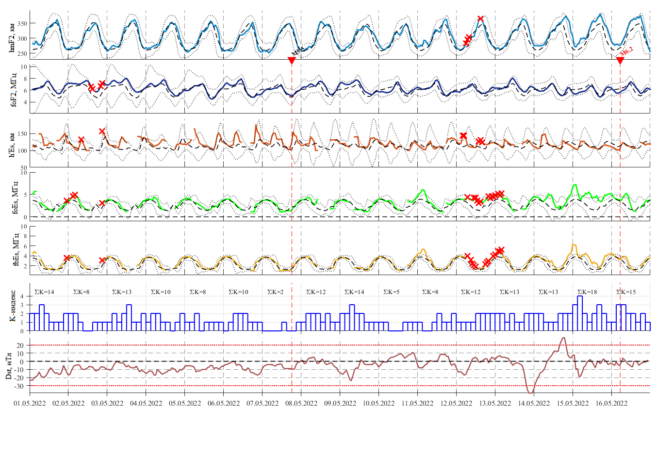 На рис. 2 представлены значения ионосферных параметров и геомагнитных индексов за временной интервал с 01.05.2022 г. по 16.05.2022 г.