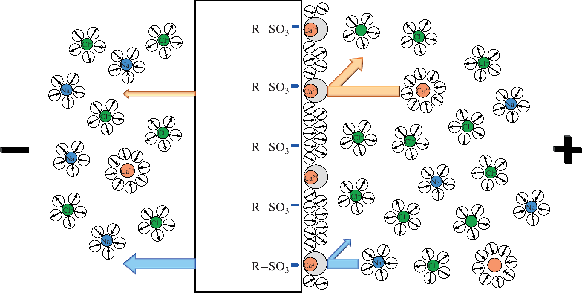 Ion-exchange membranes with high specific selectivity towards singly charged ions are in demand in various industries. One of the ways to increase the specific selectivity can be formation of a thin layer on the membrane surface with a charge opposite to the charge of its fixed groups. The possibility of forming such a layer due to the specific interaction of calcium ions with the sulfonate groups of the membrane during treatment with a high-intensity electric current in a CaCl2 solution is studied. The ability of heterogeneous (MK-40, Ralex CMH) and homogeneous (CMX, CJMC-5) sulfocationite membranes for specific adsorption of calcium ions on their surface is investigated. It is shown that the CMX membrane exhibits this ability to the greatest extent, which is due to the higher density of \( - {\text{SO}}_{3}^{ - }\) groups on its surface compared to other studied membranes. It is found that the formation of a thin positively charged layer on the surface of the CMX membrane increases the permselectivity coefficient of the membrane, \({{P}_{{{{{\text{N}}{{{\text{a}}}^{{\text{ + }}}}} \mathord{\left/