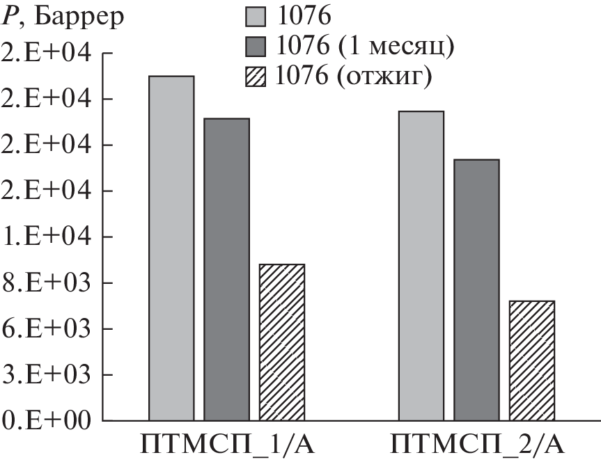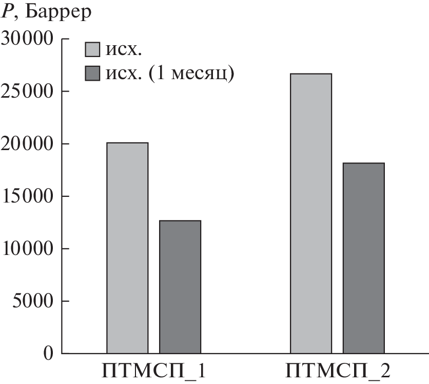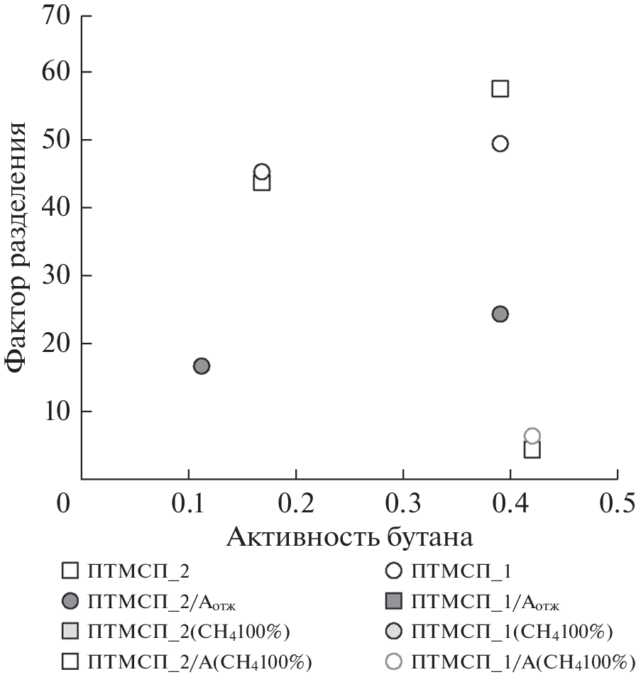 В настоящей работе впервые проведено исследование проницаемости индивидуальных низших углеводородов и в смеси С1/С4 для пленок на основе ПТМСП нового цис-обогащенного конфигурационного состава (содержание цис-звеньев в образцах составило 80 и 90%). Проницаемость по метану свежеприготовленных и выдержанных на воздухе в течение месяца пленок цис-регулярного ПТМСП (90% цис-звеньев) выше соответствующих значений пленок ПТМСП с содержанием цис-звеньев 80%. Данные РСА указывают на более рыхлую упаковку цис-регулярного ПТМСП. Введение антиоксиданта Irganox 1076 в пленки ПТМСП приводит к снижению начального уровня потока метана. В то же время проницаемость пленок с добавлением Irganox 1076 во времени (в течение 1 мес.) значительно медленнее снижается по сравнению с пленками без добавления антиоксиданта. Проницаемость индивидуальных низших углеводородов через пленки ПТМСП без и с добавлением Irganox 1076 возрастает в ряду С1 < C2 < C3 < C4. Значение фактора разделения в смеси н-бутан/метан достигает 33, что почти в 7 раз выше селективности для индивидуальных компонентов. Высокий уровень проницаемости н-бутана цис-обогащенных ПТМСП сохраняется минимум в течение месяца хранения пленок на воздухе.