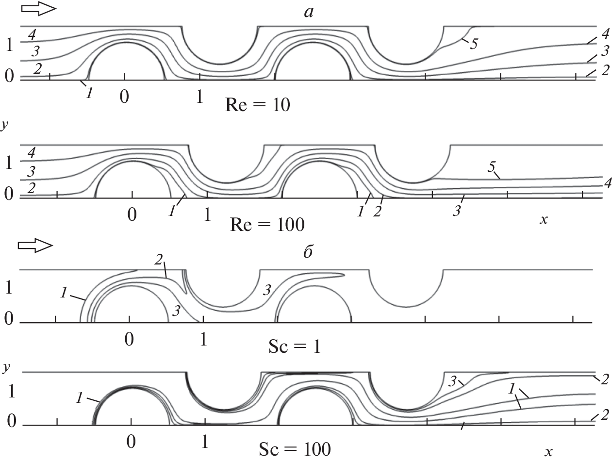 Рассчитаны внешнее стационарное течение вязкой несжимаемой жидкости и конвективно-диффузионный массоперенос растворенного вещества в упорядоченной системе параллельных половолоконных мембран, расположенных перпендикулярно потоку, в диапазонах чисел Рейнольдса \(\operatorname{Re} \) = = 0.01–100 и чисел Шмидта \({\text{Sc}}\) = 1−1000. Уравнения Навье–Стокса и уравнение конвективной диффузии решались с помощью методов вычислительной гидродинамики с граничным условием прилипания и условием постоянной концентрации примеси на внешней поверхности обтекаемого волокна. Расчеты выполнены для одного ряда волокон и для системы, состоящей из четырех и шестнадцати рядов волокон. Рассчитаны концентрации на выходе и коэффициенты поглощения примеси волокном \(\eta \) в зависимости от плотности упаковки волокон \(\alpha \) и чисел \(\operatorname{Re} \) и \({\text{Sc}}\). Показано, что коэффициент поглощения \(\eta \) волокна в изолированном ряду волокон может быть использован для расчета эффективности поглощения волокнистого слоя большой толщины.