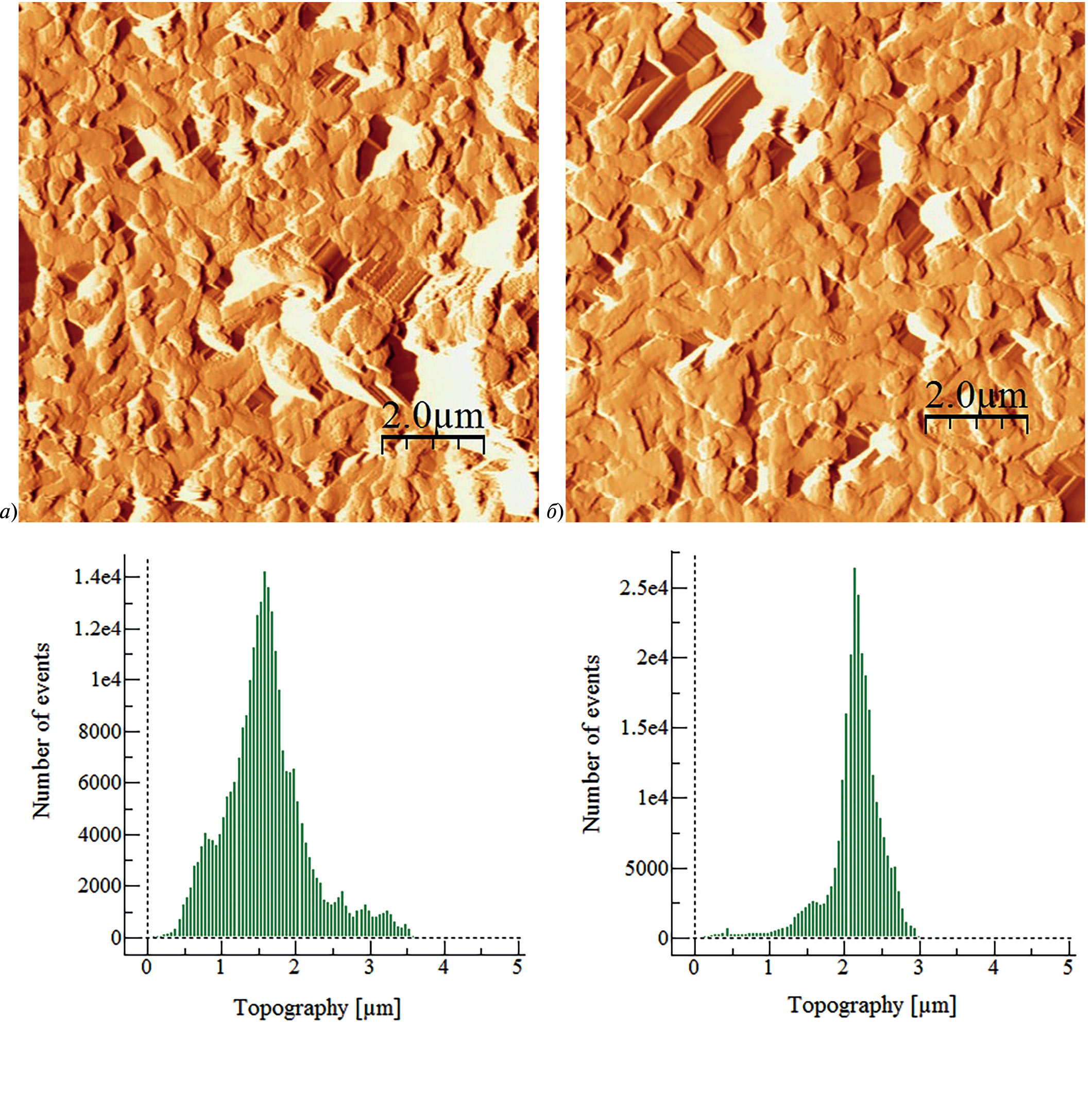 Рис. 6. Изображения поверхности с соответствующими топографическими гистограммами ПА мембраны: а) исходной; б) коронообработанной.