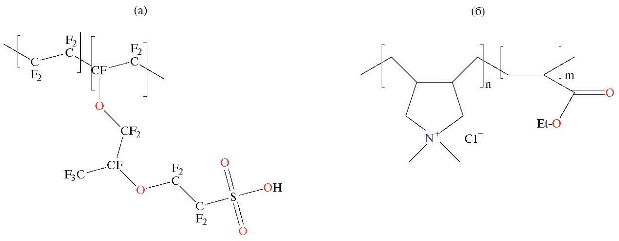 Объектами исследования являлись экспериментальные гомогенные мембраны с тонким селективным слоем из сополимера ДАДМАХ и ЭМА на поверхности мембраны-подложки из сульфированного политетрафторэтилена (МФ-4СК) производства OAO “Пластполимер”, Россия. Жидкая мембрана МФ-4СК из сульфированного политетрафторэтилена является российским аналогом мембраны Nafion [26]. Химические структуры мембраны-подложки и модифицирующего слоя представлены на рис. 1.