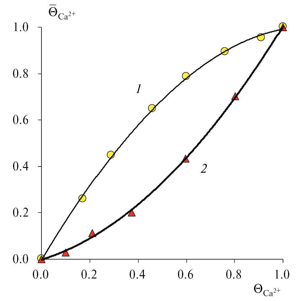 Полученные зависимости эквивалентной доли ионов кальция в мембране и модифицирующей пленки от доли ионов кальция в растворе Θ1 использовались для построения изотерм ионного обмена (3) и донанновской сорбции (4):