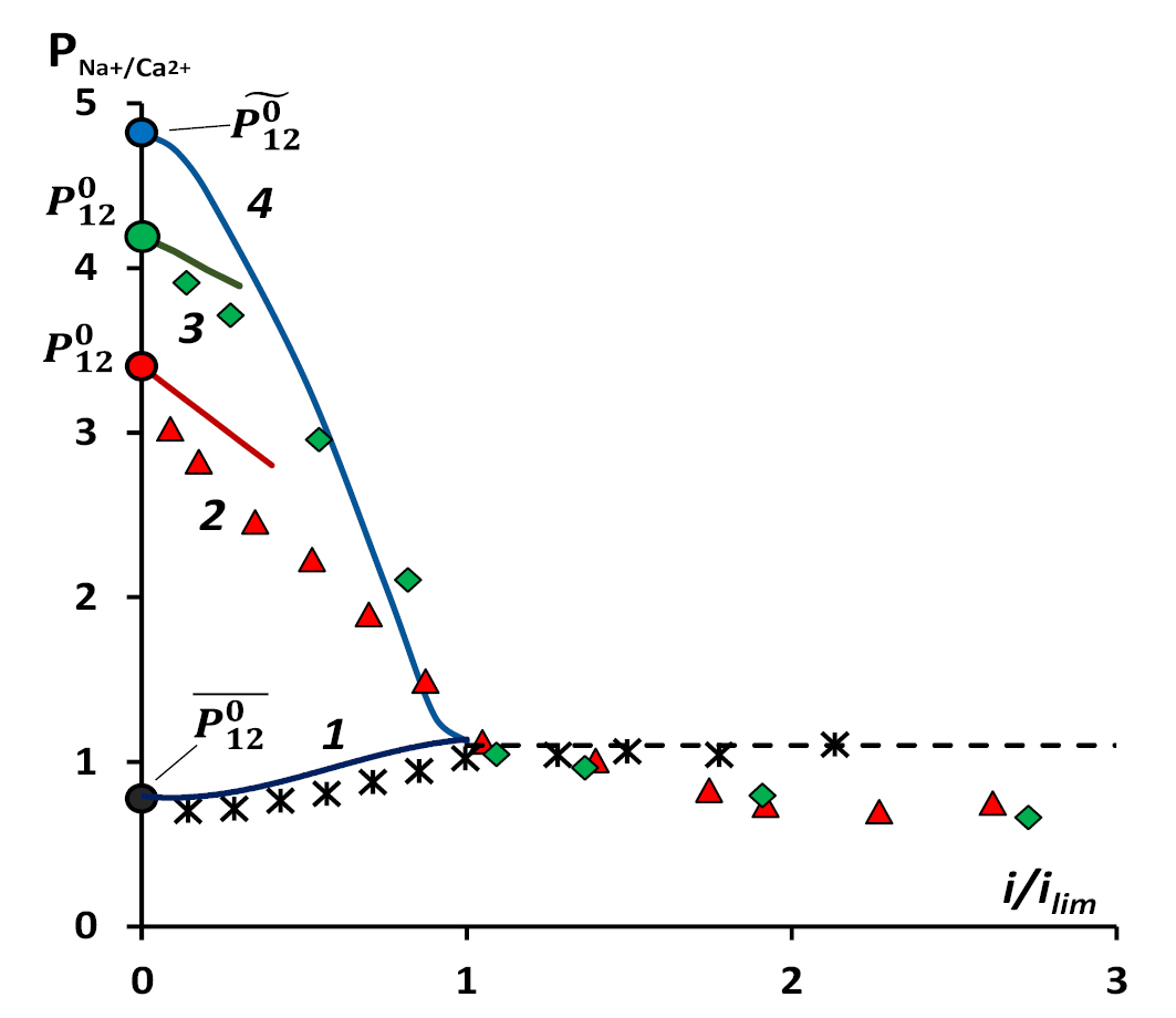 В случае с модифицированной мембраной, предельный внешнедиффузионный ток не удается достичь при наращивании плотности тока, так как в сверхпредельных токовых режимах происходит диссоциация воды на границе модифицирующий слой/мембрана-подложка, и как следствие, появляются новые переносчики тока. Анализ данных чисел переноса показывает, что при достижении предельной плотности электрического тока на модифицированной мембране поток ионов натрия снижается, а водорода увеличивается, при этом числа переноса ионов кальция практически не меняются. При достижении плотности электрического тока, равной двум предельным токам, сумма чисел переноса ионов натрия и кальция не превышает 0.6, остальные 0.4 приходятся на ионы H+. Различия коэффициентов селективной проницаемости исходной и модифицированных мембран при i > ilim могут быть связаны с изменением соотношений конкурирующих ионов в модифицирующей пленке [36].