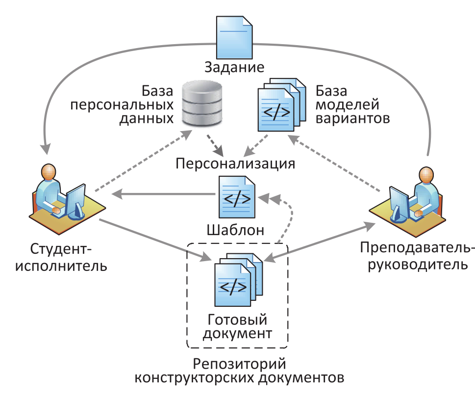 Применение шаблонов — заранее подготовленных заготовок КД, ориентированных на конкретный тип проекта и/или на студентов — распространённая практика в учебном процессе, особенно когда КД выполняются в электронном виде. Идея персонализированных шаблонов предусматривает индивидуальную настройку заготовок КД с учётом персональных данных студента, варианта выданного ему задания, а также проектных решений в ранее созданных КД (рисунок 1). Использование персонализированных шаблонов призвано освободить студента от ручного внесения в КД тех данных, которые можно извлечь из информационной базы процесса УП.