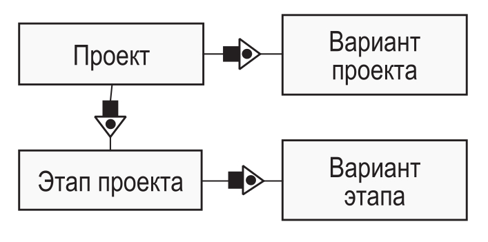 «Вариант этапа» содержит экземпляры, соответствующие вариантам ТЗ для каждого экземпляра этапа проекта. У каждого экземпляра проекта может быть несколько дочерних экземпляров варианта этапа, но каждый экземпляр варианта этапа соответствует только одному экземпляру этапа проекта и идентифицируется через него.