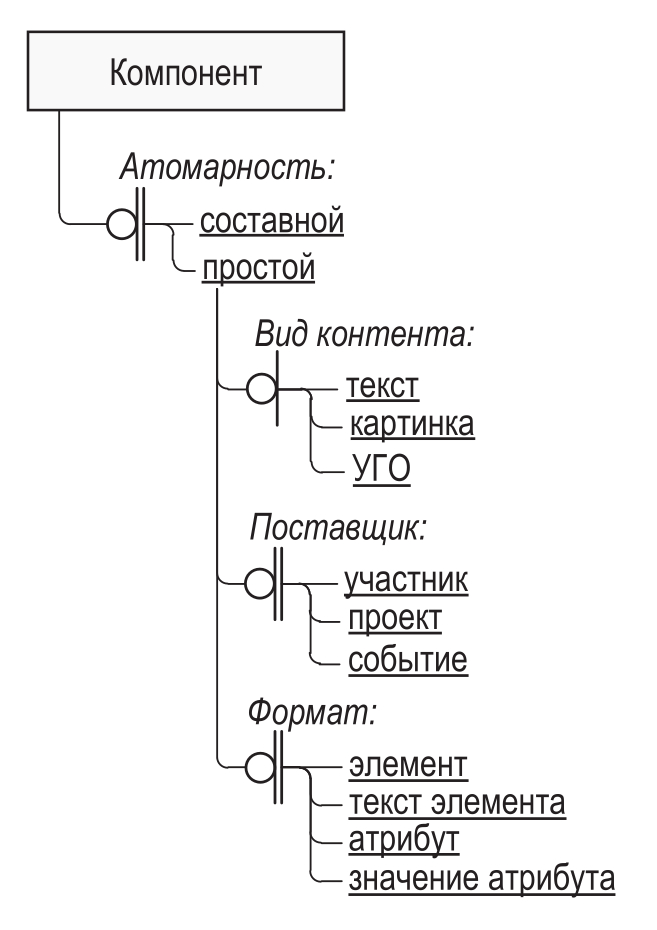 На рисунке 4 представлены диаграммы категорий для двух классов НКМ. Экземпляры класса «компонент» подразделяются по признаку атомарности, которая задаёт категоризацию НКМ в зависимости от внутренней структуры, существенной для персонализации: НКМ может быть простым либо составным. Составной НКМ содержит вложенные (дочерние) НКМ, совокупностью которых можно манипулировать как единым целым. Простой НКМ подразделяется на три категории: по виду содержания, по поставщику и по формату.