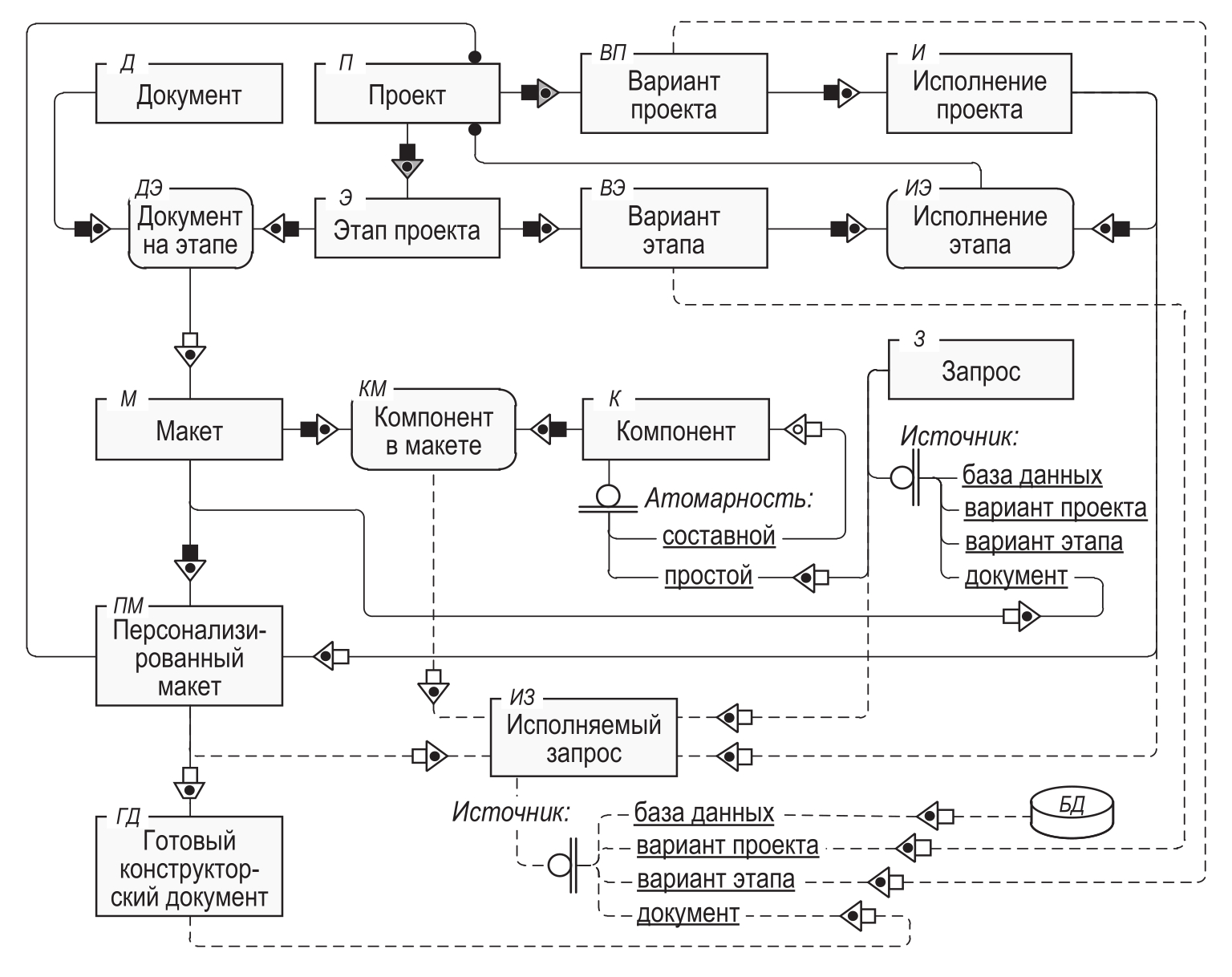 Отношения «многие-ко-многим». Классы ДЭ, ИЭ, КМ содержат экземпляры, соответствующие парам экземпляров своих родителей. Так, экземпляр ДЭ соответствует паре «экземпляр документа — экземпляр этапа проекта»; экземпляр ИЭ соответствует паре «экземпляр варианта этапа — экземпляр исполнения проекта»; экземпляр КМ соответствует паре «экземпляр компонента — экземпляр макета». Экземпляры этих классов идентифицируются через связи от своих родителей (являются «полными иждивенцами» — скруглённые прямоугольники). Эти классы задают связи типа многие-ко-многим между своими родителями: например, одному экземпляру макета М может соответствовать ноль, один или несколько экземпляров компонента К; одному экземпляру компонента К может соответствовать ноль, один или несколько экземпляров макета М.