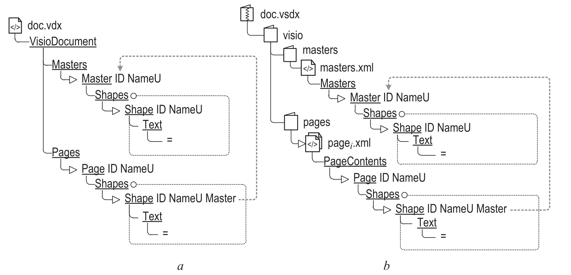 Рисунок 9 – Модели доступа к элементам графических документов в форматах VDX (а) и VSDX (b)