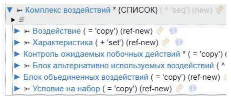 Лечение может быть разделено на этапы, каждый этап лечения представляет собой набор клинических мероприятий, организованный либо по временным отрезкам, либо по достижению показателей, соответствующих цели лечения. Каждый этап лечения содержит комплекс воздействий и продолжительность этапа воздействия. Структура раздела Комплекс воздействий позволяет формировать знания о любых манипуляциях с пациентом по различным видам лечения (cм. рисунок 3).