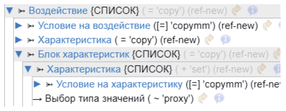Воздействие - основной раздел онтологии, характеризующий тип манипуляций с пациентом (см. рисунок 5) и позволяющий описать любой фактор, имеющий доказанное лечебное действие, например, действующее вещество, физиопроцедура, массаж, хирургические манипуляции (перевязка, наложение шва, обработка ран и др.). Для этого в онтологии имеется блок Условие на воздействие, описывающий перечень клинических показателей, при которых данное воздействие может быть рекомендовано к использованию, а также разделы, описывающие свойства, параметры и ограничения воздействия: «Характеристика» и «Блок характеристик».