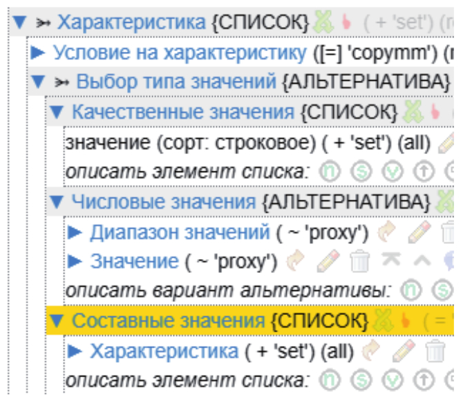 Характеристика – универсальный элемент онтологии, предназначенный для описания параметров, свойств и ограничений какого-либо объекта или процесса (см. рисунок 6). Он также содержит собственный блок условий, необходимый для выбора конкретной характеристики, соответствующей картине заболевания. Данный раздел имеет универсальную структуру и позволяет задавать любые типы значений и параметров воздействия, такие как периодичность, дозировка, сила тока, длительность воздействия, мазок на флору и др. Характеристики могут объединяться в Блок характеристик, например, блок Правило приёма включает Форма выпуска, Способ применения и др.