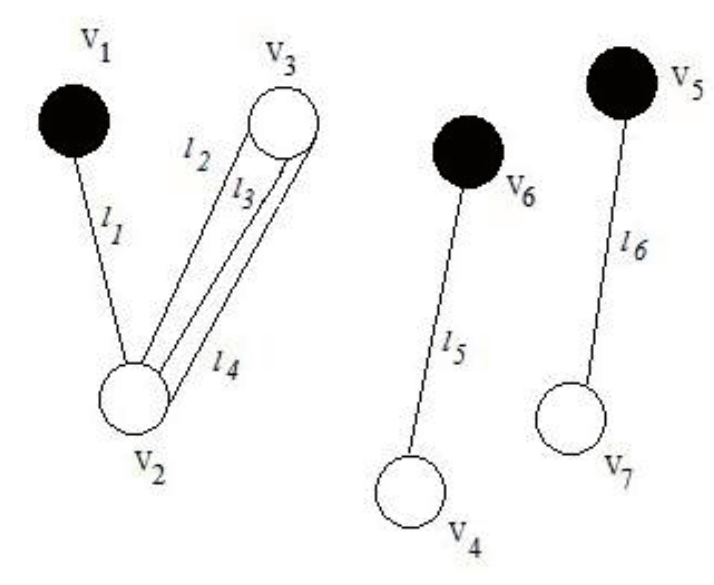 При построении графовой модели схемы Э3 не учитывались электрические цепи, подключаемые на корпус ЛА, а также допущено, что n – количество рёбер, соединяющих две вершины, может быть n≥1. Данное условие необходимо, т.к. схема Э3 БС может содержать n≥1 электрических цепей, которые соединяют элементы БС. Этот важный аспект, вводимый при построении графов, способствует приближению введённой графовой модели к реальным электрическим схемам. Вершины Vi, графически обозначенные как «○», представляют собой такие элементы БС, подключения к которым осуществляются через разъёмные электрические соединители (разъёмы, наконечники). Вершины Vi, обозначенные как «●», представляют собой элементы БС, подключения к которым осуществляются внутренним монтажом через неразъёмное соединение, например пайкой, применяемой для соединения коммутационных элементов и элементов защиты сети от токов короткого замыкания [14].