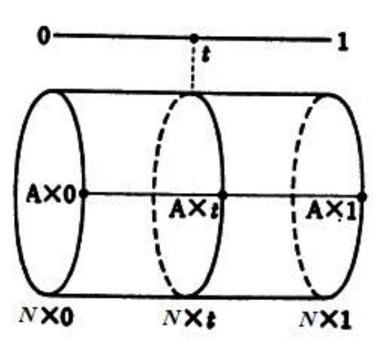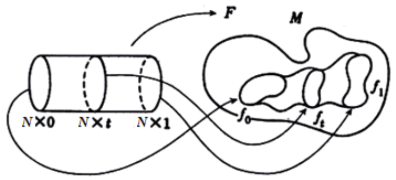 Если в пространстве NхI рассматривать подпространство точек (A,t) при фиксированном t, то оно гомеоморфно монтажному пространству М. Пространства M и N гомотопны, если существует непрерывное отображение F:Nx1 →M такое, что F:Nx0→M совпадает с f0, а F:Nx1 →M совпадает с f1, где F – топологическое отображение пространства N в M (рисунок 7).