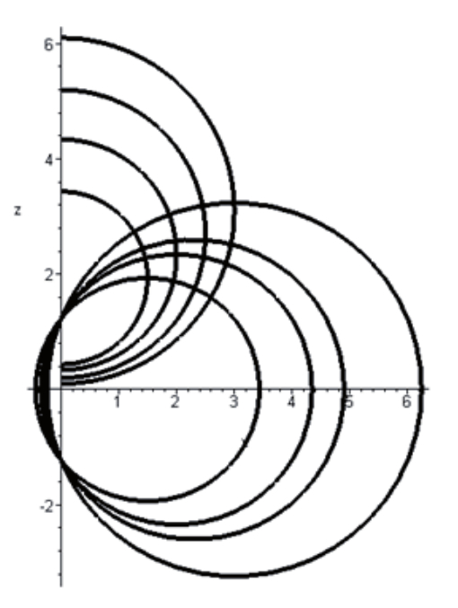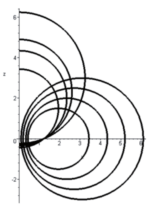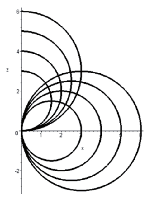 Пучком окружностей на плоскости называют множество окружностей1, имеющих общую радикальную ось. В зависимости от количества общих точек, имеющих окружности пучка с радикальной осью, пучки могут быть: гиперболические (нет общих точек), параболические (одна общая точка) и эллиптические (две общие точки). Пучки окружностей с центрами на осях OX и OZ, радикальными осями которых являются соответственно оси OZ и ОХ, называют сопряжёнными. Параметрические уравнения семьи окружностей имеют вид: